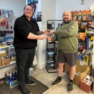 Matt Foreman (right) of Car Builder Solutions receives his Dynamat Dealer of the Year award