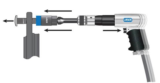 For removal, just thread on the appropriate socket and use the air punch with an air chisel to drive out the old stud. For installation, the bearing ensures smooth fitting as the new stud is drawn into position using a 21mm socket.