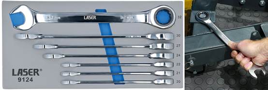 Building on the success of the 8511 12-piece bi-hex ratchet ring spanner set, and due to customer demand, Laser Tools introduces the seven-piece Ratchet Ring Combination Spanner Set(part number 9124), covering the most in-demand sizes from 20 mm to 32 mm. Each spanner features a 72-tooth ratchet mechanism that delivers a mere 5° swing arc, making fastener turning both rapid and possible in even the most confined spaces.