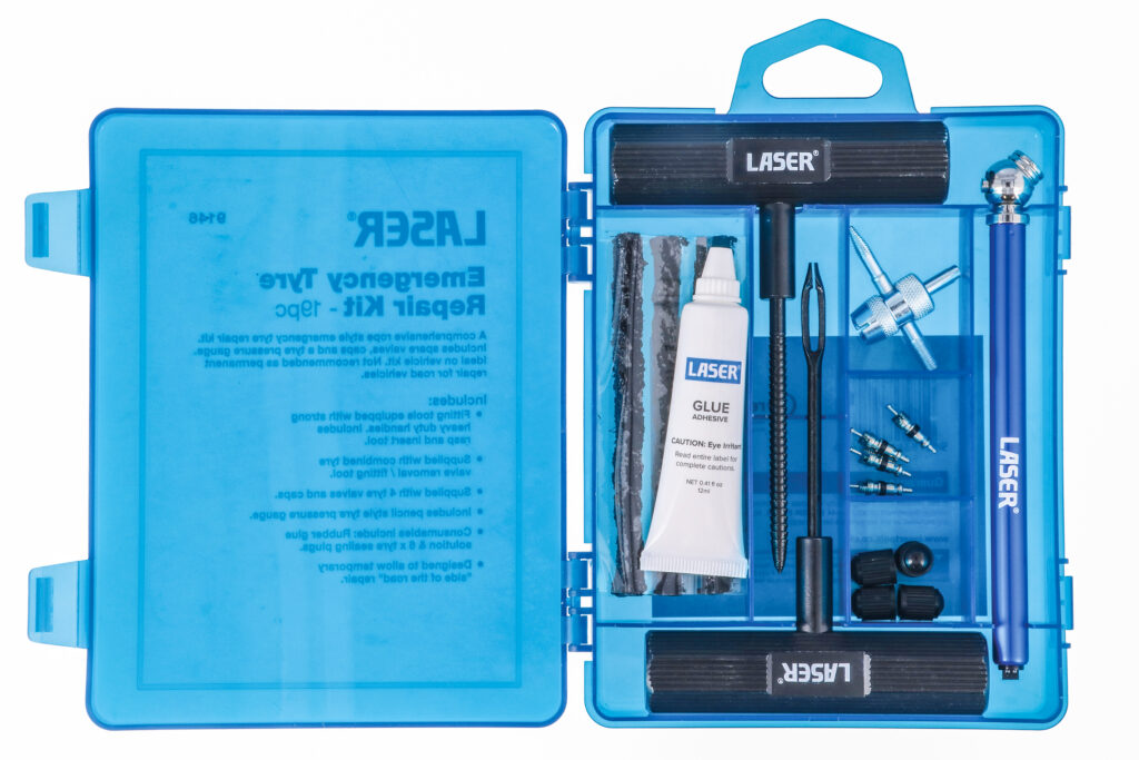 A flat tyre can happen anywhere, and often at the most inconvenient moment. The Laser Tools Emergency Tyre Repair Kit (part number 9146), is designed to provide drivers with the tools needed for a quick, roadside repair – allowing them to get moving again without waiting for breakdown recovery.