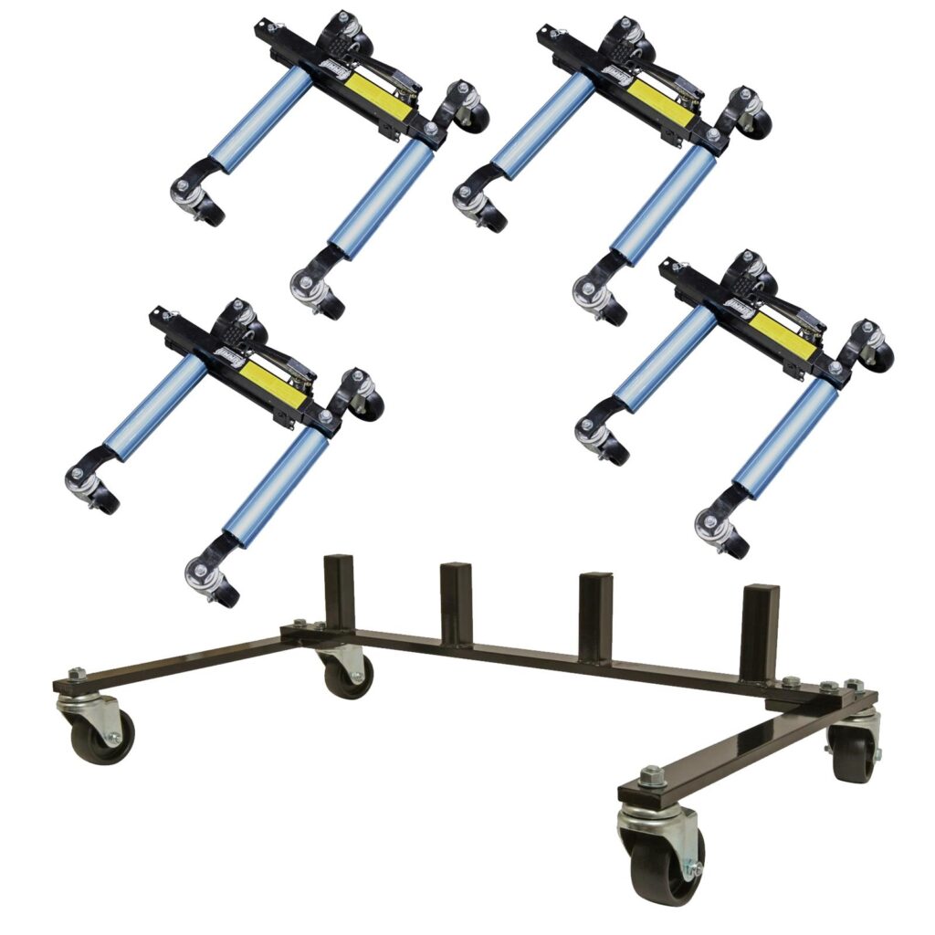 Summit Racing Hydraulic Wheel Dollies have four-inch diameter nylon casters that easily roll over uneven surfaces. You get four dollies plus a steel storage rack. The dollies are also available individually if you need a couple of extras.