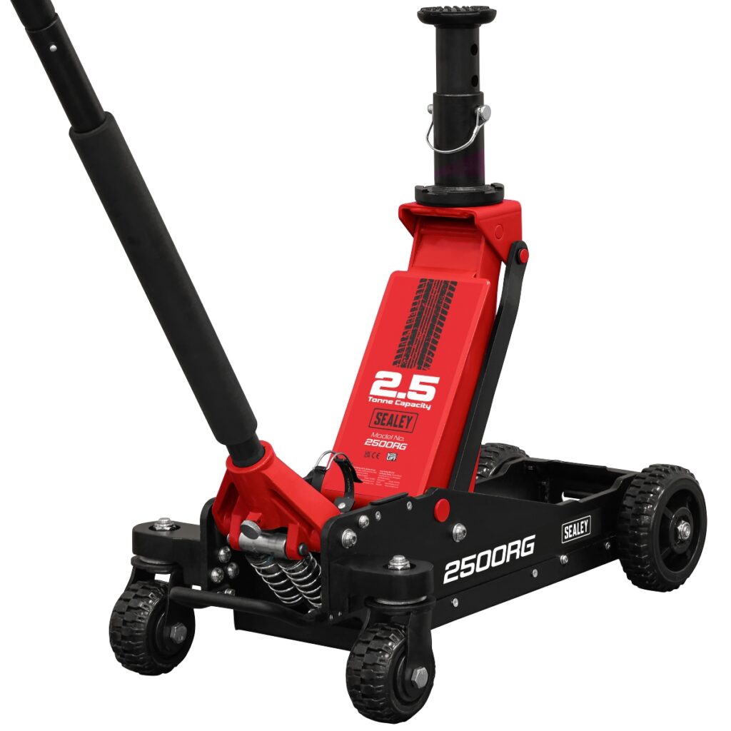 SEALEY has expanded its Jacking and Lifting range with impressive new arrivals, including the 2500RG Big Wheel Trolley Jack. Engineered for smooth manoeuvrability and enhanced reach, it features oversized fixed castor wheels that tackle rough and uneven surfaces with ease. A quick-change adjustable height extension with saddle offers an added range of 126–194mm, providing a total lifting span from 150mm to an outstanding 714mm.