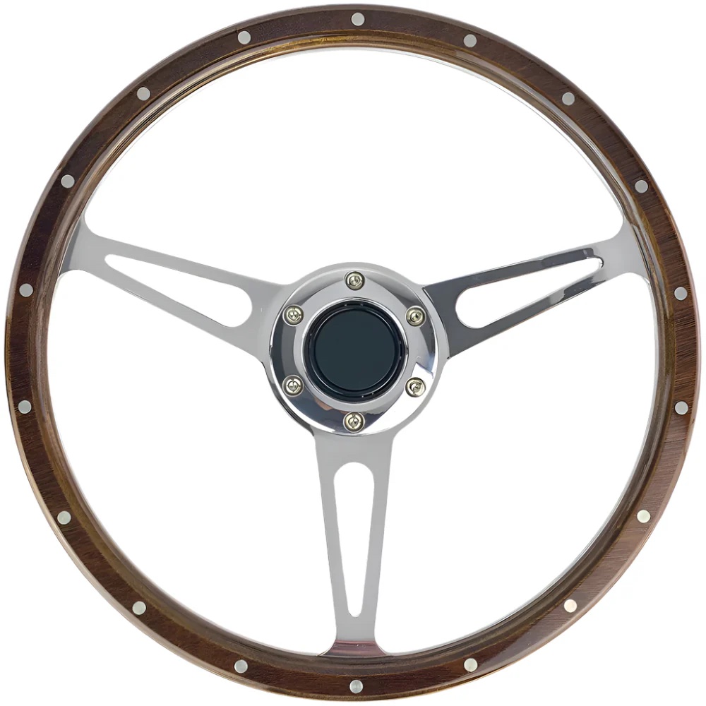 Top and botton wooden rims are bonded and riveted to a strong 5mm thick dished aluminium pressing. It has a polised and lacquered finish and a centre ‘push’ horn.