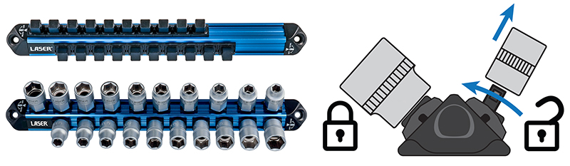 A new patented socket storage system from Laser Tools: the LocSoc range of magnetic socket rails – sockets are locked in place to prevent accidental loss and keep tool drawers and shadow boards neat and scratch-free.