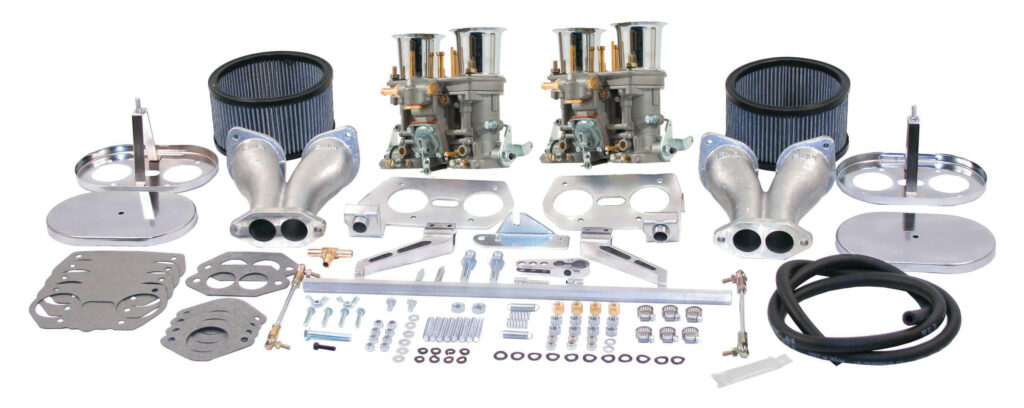 Kits come with dual EMPI carburettors, aluminum intake manifold, chrome air cleaner with high-flow gauze element, throttle linkage (depending on model), gaskets, and hardware. All kits are rigorously tested for smooth operation. EMPI notes that its HPMX dual carburetors are test-run as a matched pair and pre-set for left and right sides, with float levels checked and adjusted.